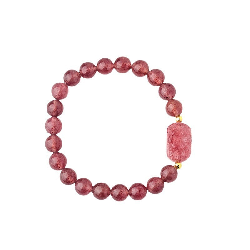 The floral-carved strawberry quartz plate amplifies "peach blossom luck" (姻缘), while round beads stabilize relationships.