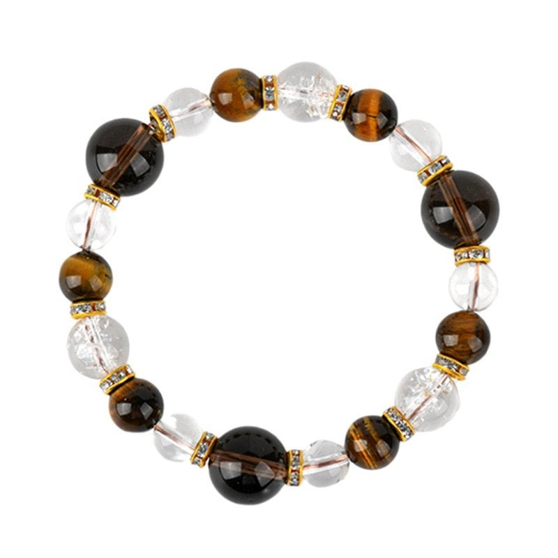 Yellow tiger eye (Earth element) boosts courage, tea quartz (Earth element) stores wisdom, white crystal (Metal element) sharpens focus. Double-element protection for stable career growth.