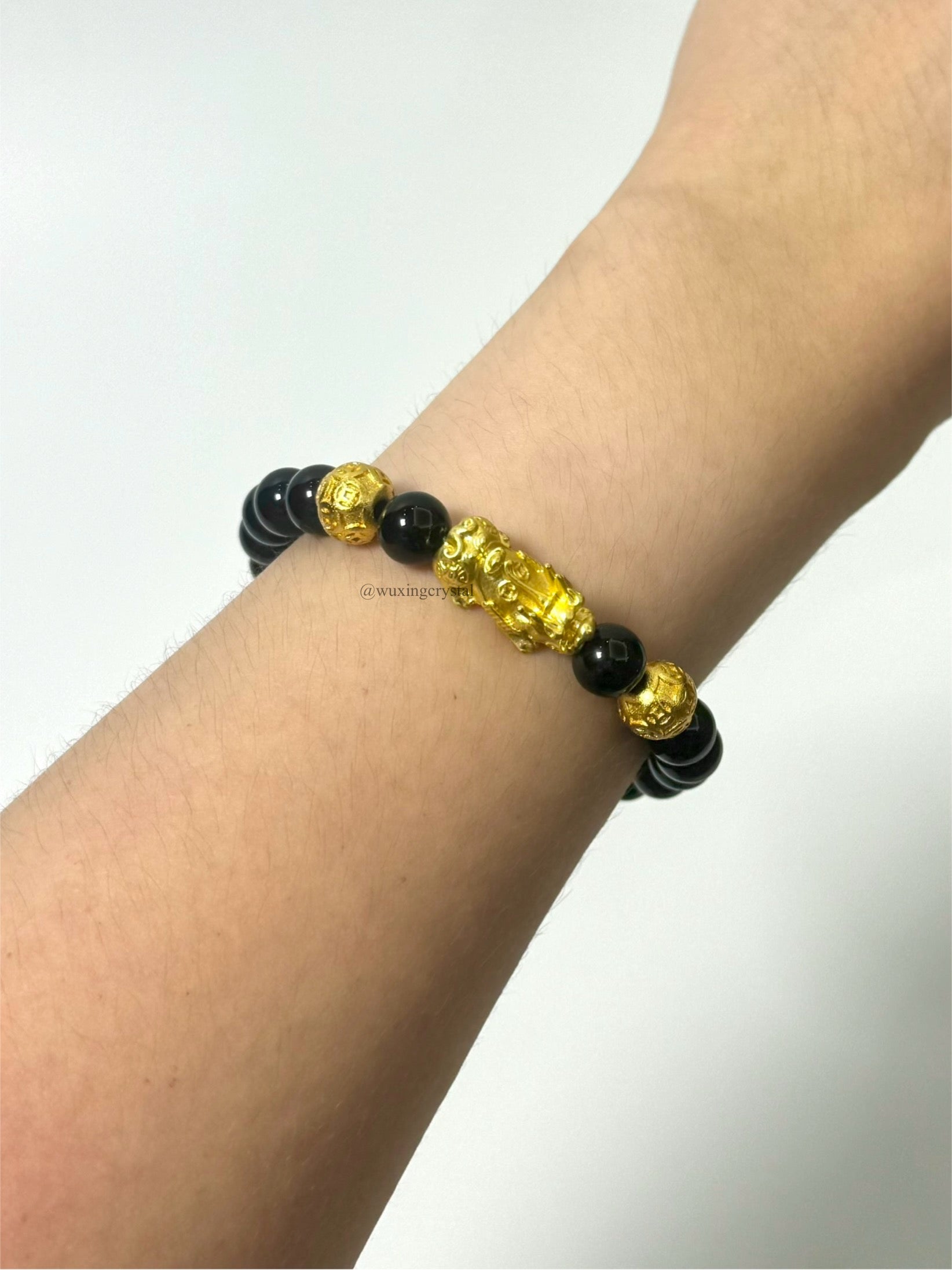 A powerful symbol of protection and prosperity, this bracelet features 8 mm natural obsidian beads paired with a finely detailed gold-plated Pixiu charm. The deep black and gold combination creates a bold, refined look suitable for daily wear.